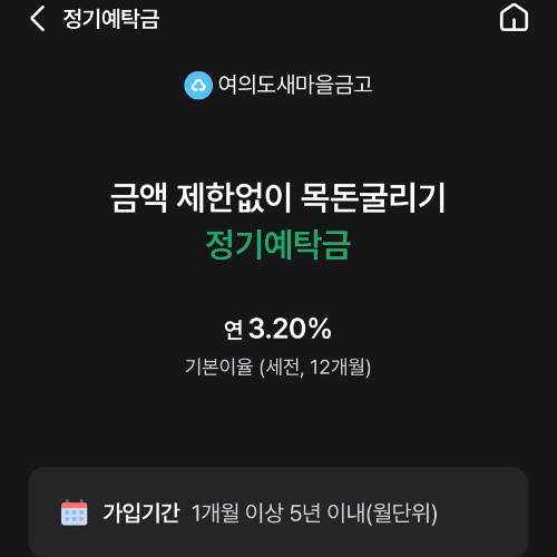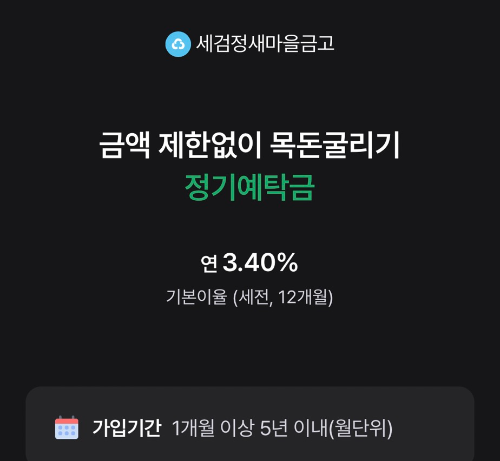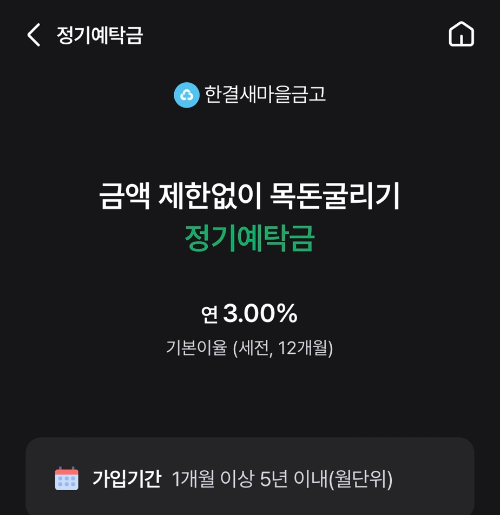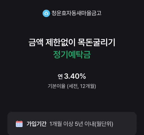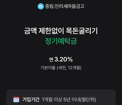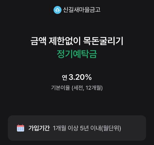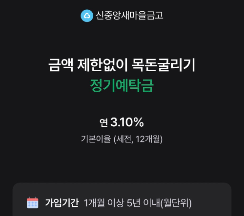 새마을금고 정기예탁금은 일정 금액을 일정 기간 예치한 뒤 만기 시 원금과 이자를 함께 받는 구조로, 가입 대상과 저축 한도에 제한이 없고 1개월부터 최대 5년까지 유연하게 기간을 설정할 수 있다는 점이 특징입니다.